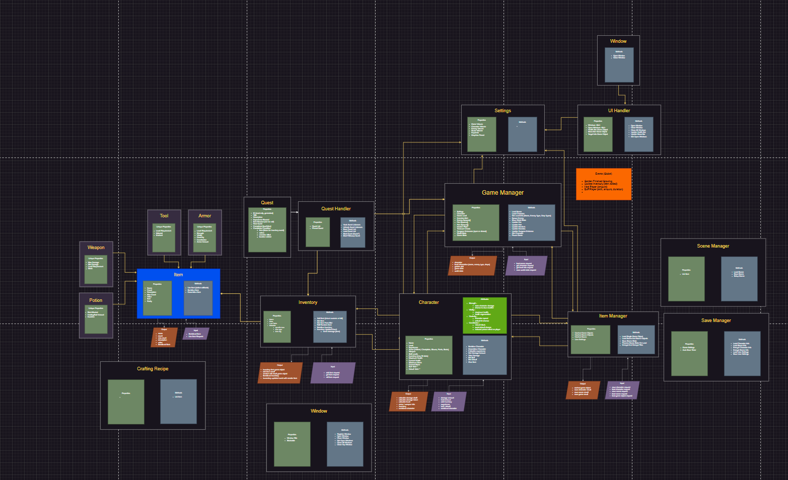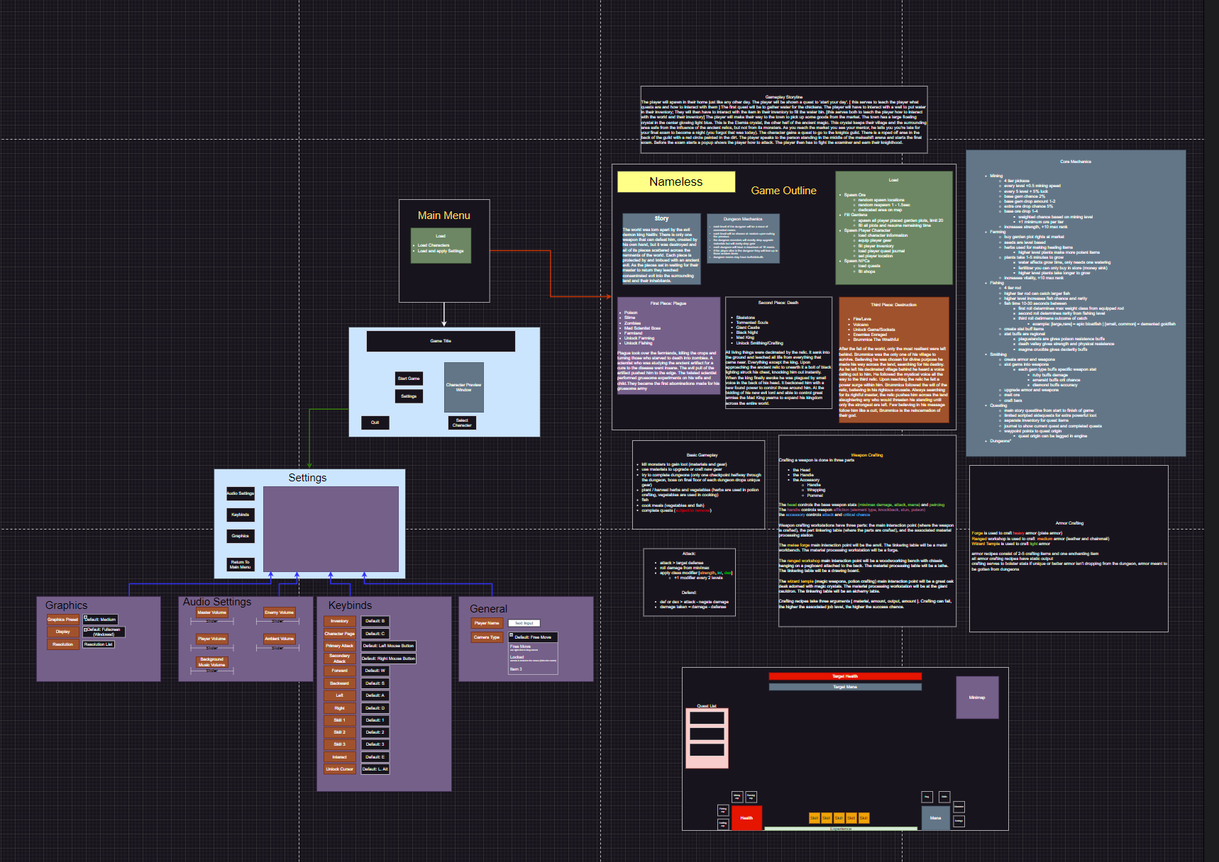 Putting together Nameless has not been an easy task. It all had to start with some good planning. It's important to lay down the bones you want your game to follow, and the direction it needs to go in, before you start putting in any of the actual groundwork. For me, this mainly consisted of dropping my thoughts into flowcharts and mapping out potential classes and how they work. It probably looks like a jumbled mess, and that's because it is! It really helped me frame out the backend of my game and get the ball rolling.