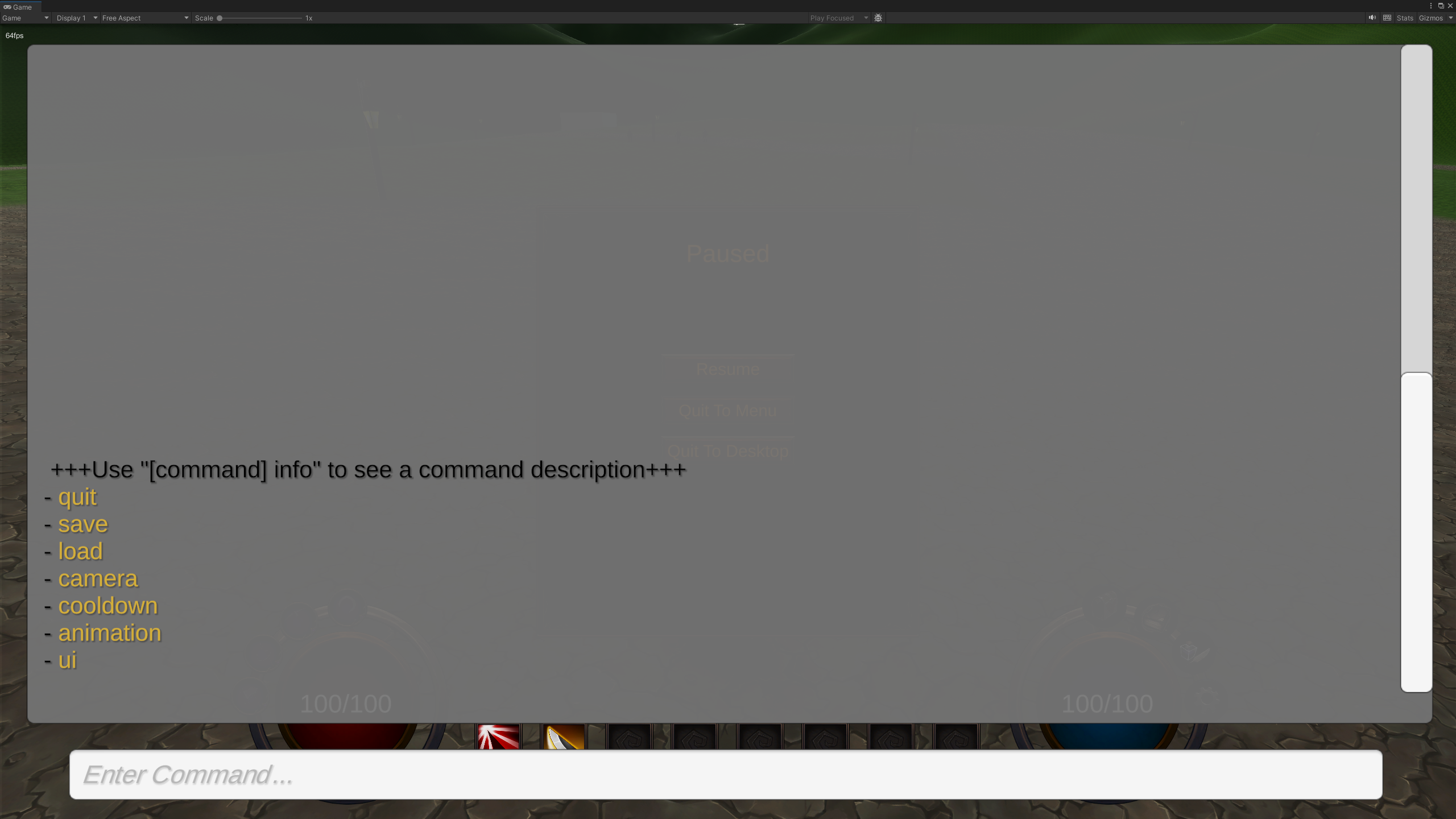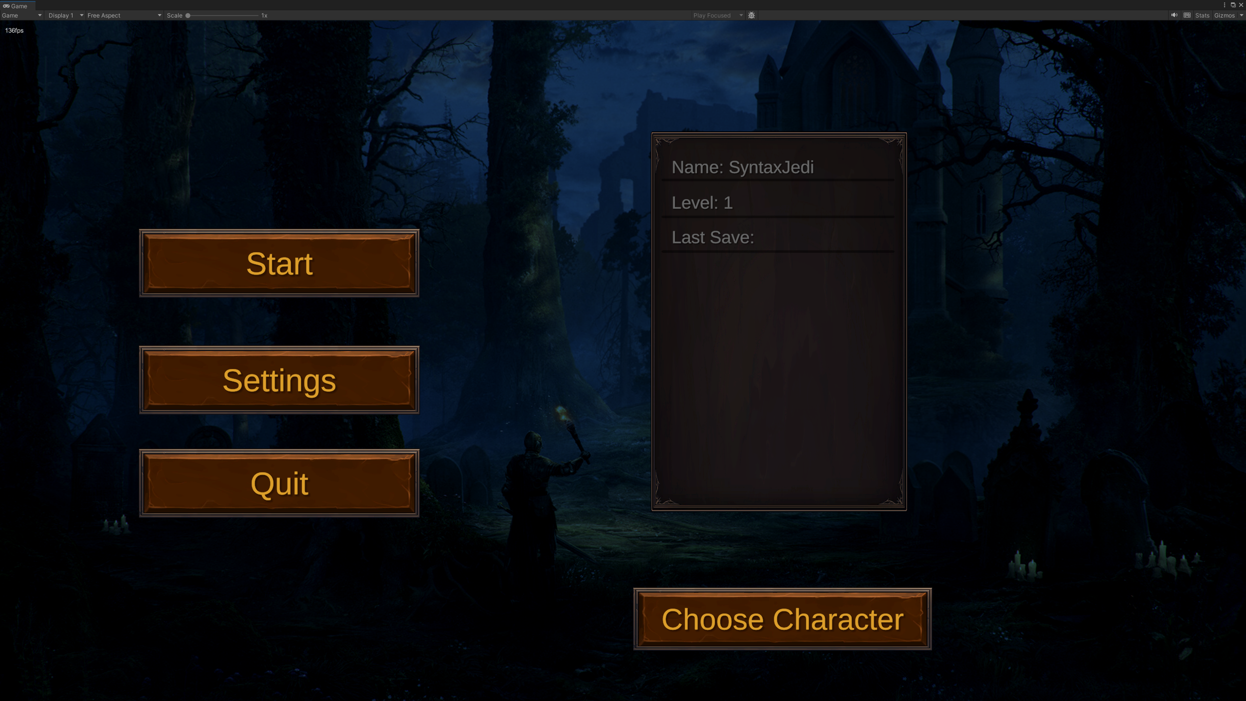 Once most of the core features and class structure was planned, it was time to move onto the design and development. I always like to start with the menus. The main menu is the first interaction point in the game so it's really easy to jump off from there. Once I get the placeholders in for a few menus and some button interactions, I can really start in on the code. I really wanted to focus on longevity and expandability in this project, so I created a handful of helper tools and a command interface. The helper tools, or 'Nameless Utility', cover everything from loading and caching game objects, to encrypting character saves. The command interface lets me create custom commands with callbacks that allow me to debug and interact with various features in game. Both of these tools allowed me to streamline development immensely and get the bare game up and running. At this stage in development, I was mostly working on the core backbone of the game. I was mainly focused on the flow into the game. Making sure that everything starting from pressing play through loading into the game world was properly working.